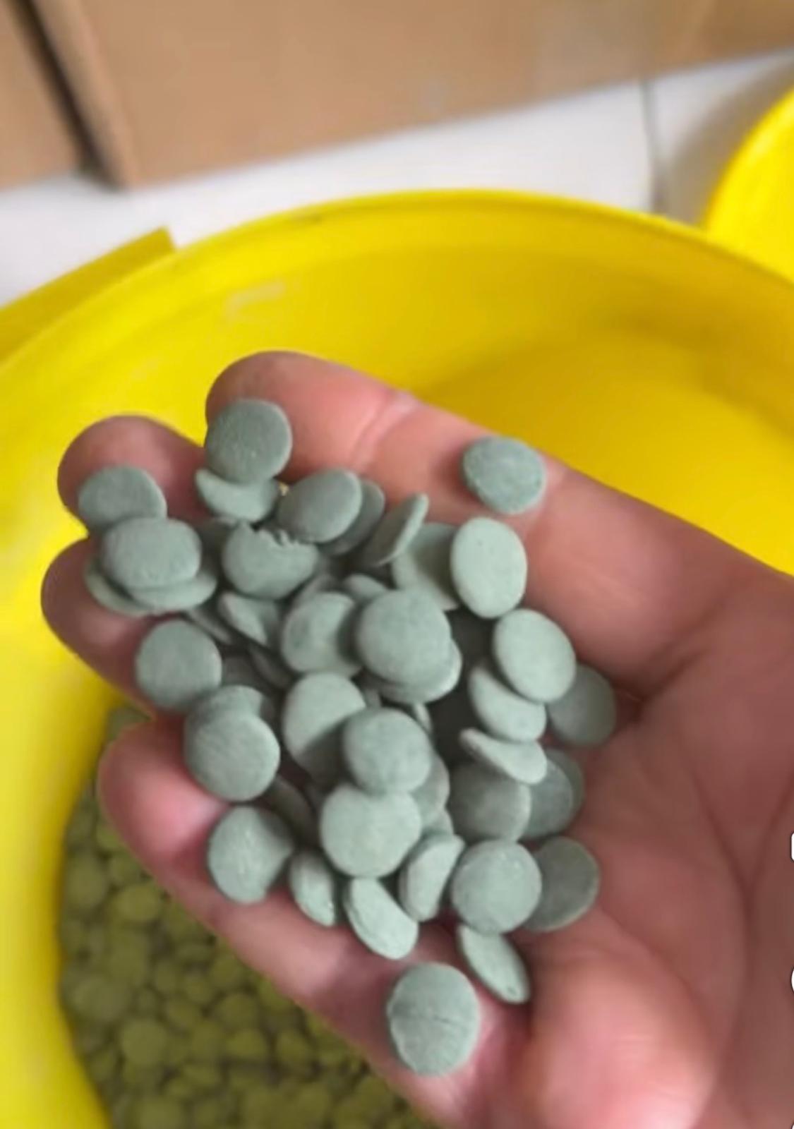Spirulina ile zenginleştirilmiş 12mm ölçüsünde wafers şeklinde yem.