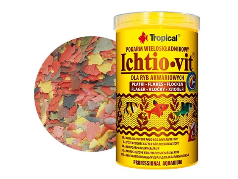 tropical ıchtio-Vit, zengin içeriğiyle balıklarınızın günlük beslenme ihtiyaçlarını karşılayabilecek pul yemdir. En popüler etçil ve otçul balıkların günlük beslenmesi için kullanılabilir. Tropical ıchtio-Vit, bitkisel ve hayvansal kaynaklı içeriklerden özenle seçilmiş üretilmiştir. Dengeli vitamin seti ve eser elementler sayesinde, düzenli kullanıldıklarında balıkların doğru büyümesini ve gelişmesini sağlar. Yem içeriği balık ve balık türevleri, tahıllar, bitkisel protein ekstreleri, yumuşakçalar ve kabuklular, bitkisel kökenli türevler, algler, mayalar, sıvı ve katı yağlar, mineraller (% 1 zeolit dahil). Katkı maddeleri (kg başına) benzer etkiye sahip vitaminler, ön vitaminler ve kimyasal olarak iyi tanımlanmış maddeler: Vit. 23.000 ıu, vit. D3 1400 ıu, vit. E 90 mg, vit. C 340 mg. Eser elementlerin bileşikleri e1 (fe) 27.1 mg, e6 (zn) 7.4 mg, e5 (mn) 5.6 mg, e4 (cu) 1.33 mg, e2 (ı) 0.16 mg, e8 (se) 0.16 mg, e7 (mo (mo) ) 0.037 mg. Lesitin. Renklendiriciler. Antioksidanlar. Analitik bileşikler ham protein% 45.0, ham yağlar ve yağlar% 6.0, ham elyaflar% 2.5, nem% 6.0.