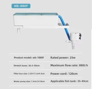 WaterBear 1880F Akvaryum Tepe Filtre, küçük ve orta boy akvaryumlar için geliştirilmiş, güçlü motor performansı ve çok yönlü filtrasyon sistemi ile etkili bir dıştan takmalı filtre çözümüdür. 25W güç tüketimi ve 880 L/H su debisi sayesinde akvaryum suyunu sürekli dolaştırarak zararlı maddelerin uzaklaştırılmasına ve oksijen seviyesinin artırılmasına yardımcı olur.